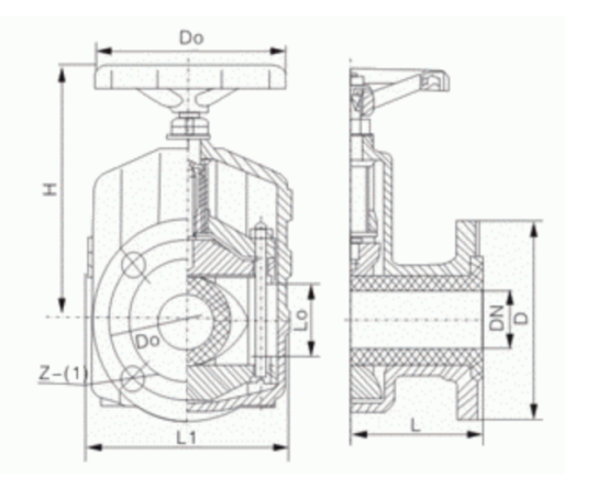 当顺时针转动手轮时,使大小阀杆同时带动上下压板,压缩管套进行关闭。反转即行开启,这样压板在拉杆之间上下往复运动完成阀门开闭工作。